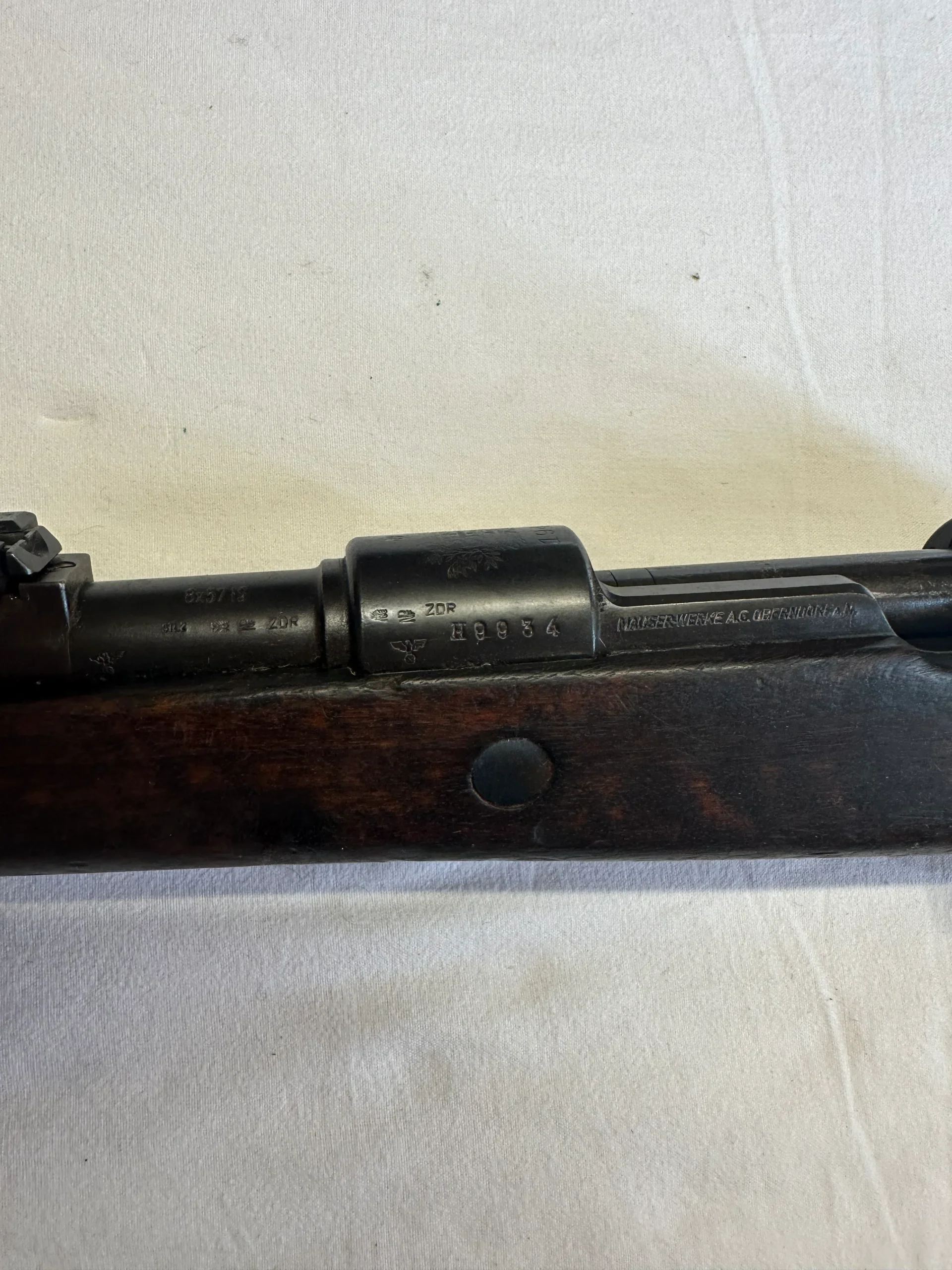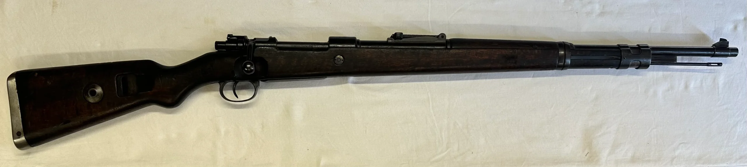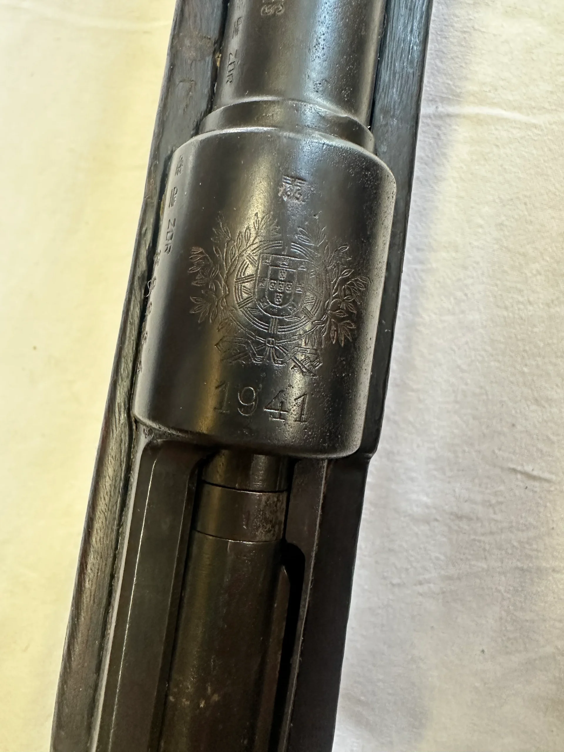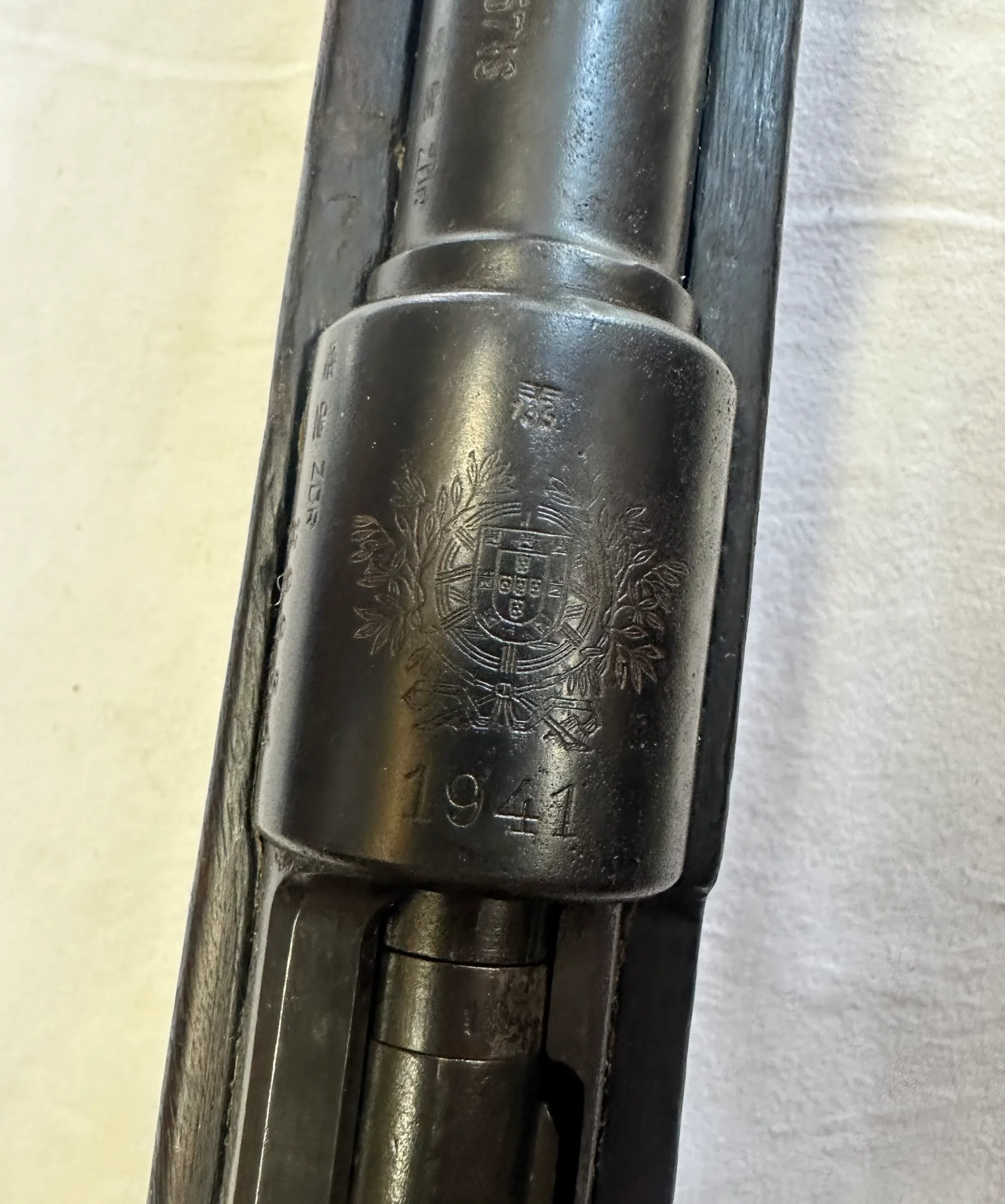 Beau Mauser 98K portugais, fabrication Mauser de 1941, monomatricule, avec tous les poinçons allemands y compris sur la crosse (il est peu lisible mais présent) et le superbe blason portugais sur le tonnerre. Belle crosse en noyer avec quelques traces de manipulation, bronzage très homogène et présent à 80-90%, avec baguette. Canon gris mais rayures bien nettes. Une belle pièce pas courante en monomat.