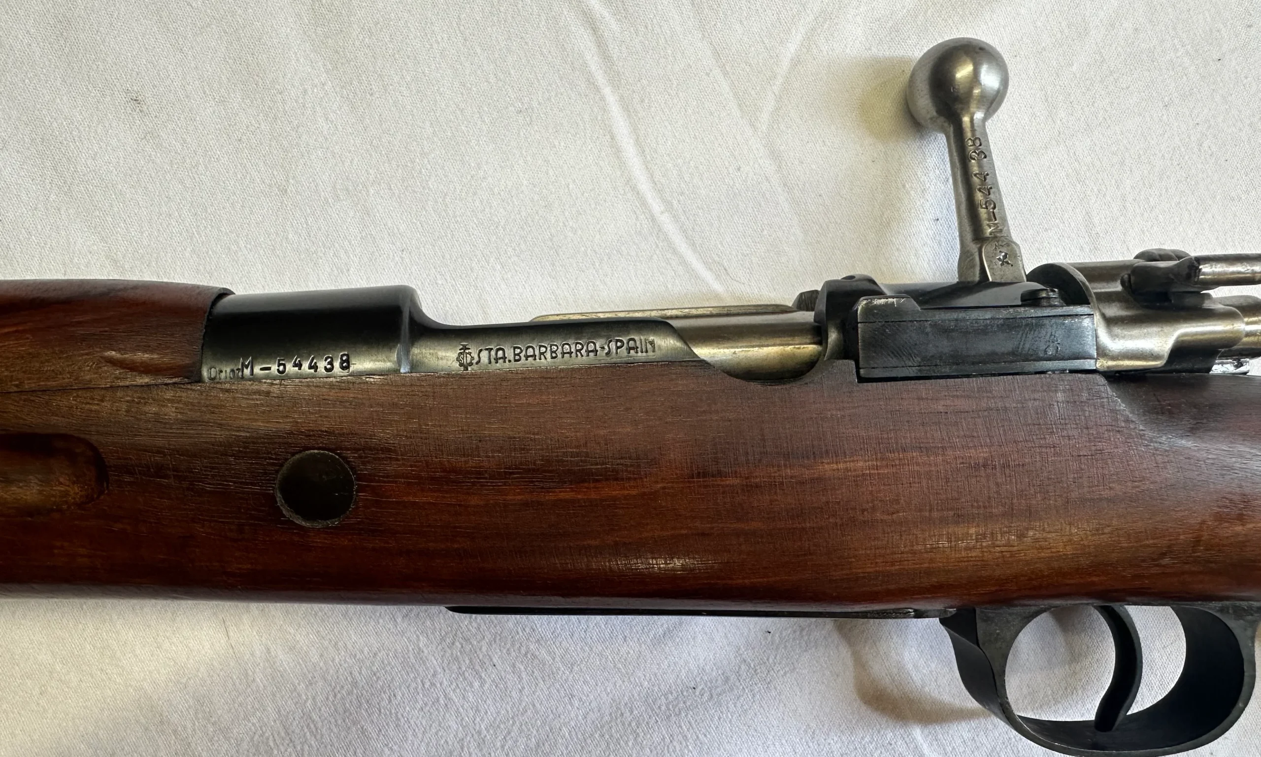 Très beau Mauser espagnol 98/43, bien marqué Santa Barbara Spain, fabriqué à la Coruna en Espagne, calibre 8x57JS, arme proche du neuf avec baguette et couvre-bouche. Boitier et culasse au même numéro, mais pas la sous garde. Canon quasi neuf. Idéal pour le tir ou bien pour completer une collection de Mauser. Arme éprouvée (poinçons d’épreuve allemands).