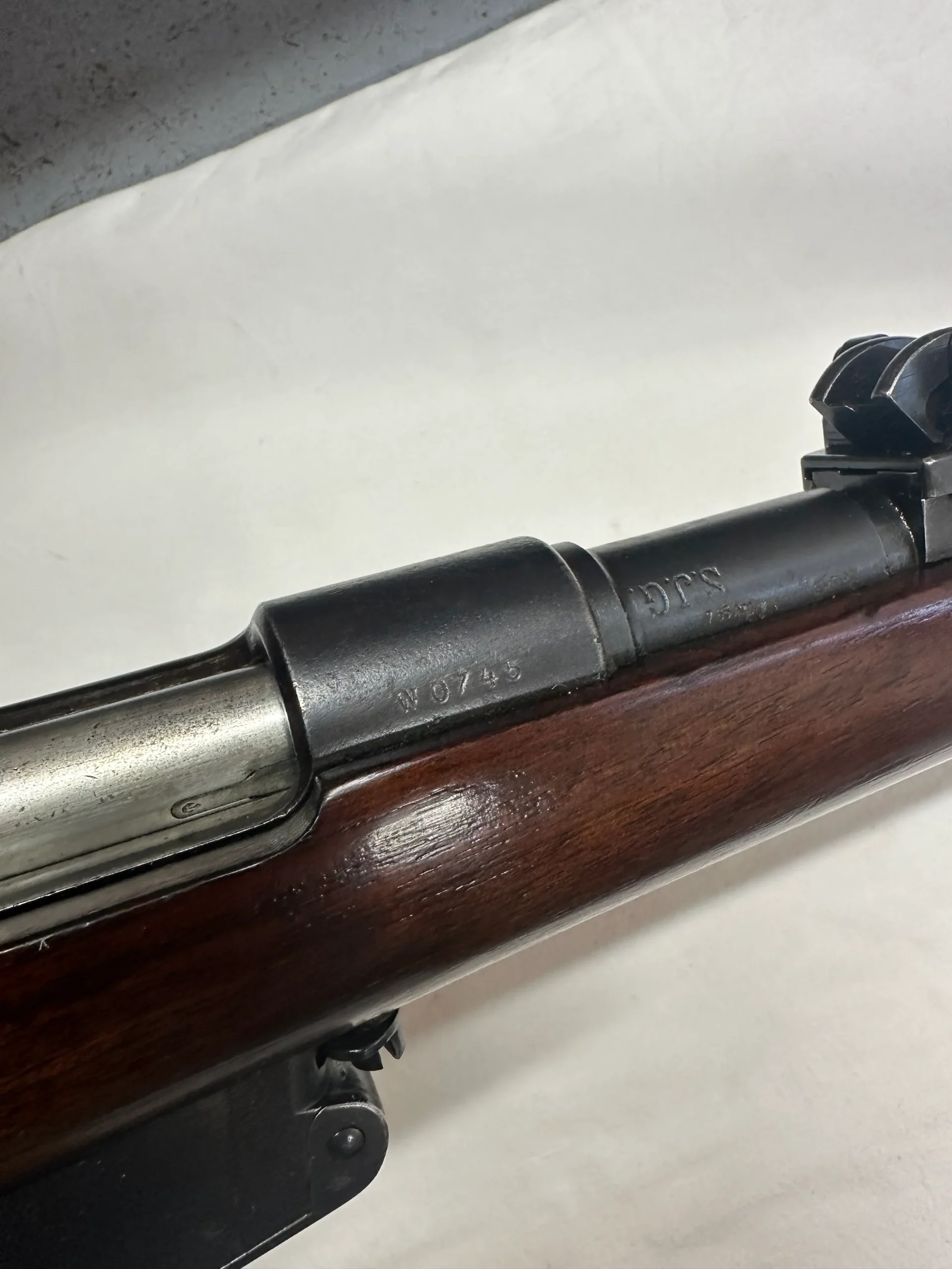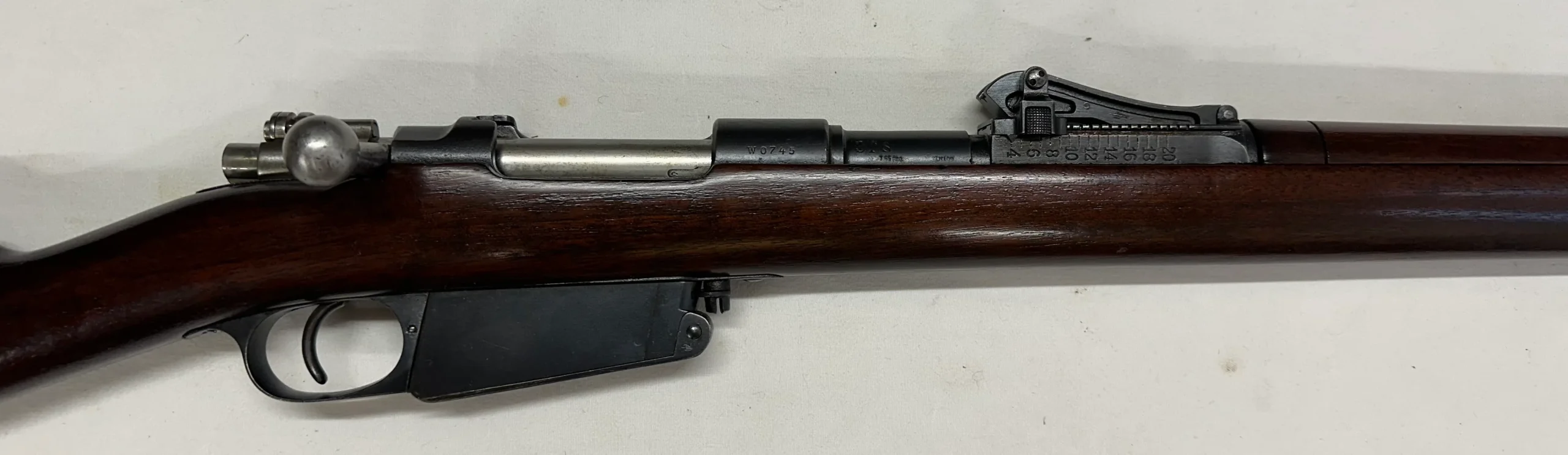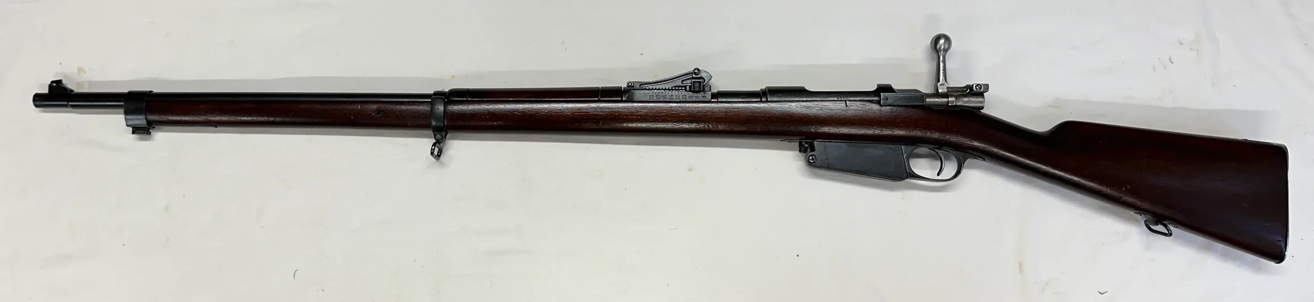 Bien que non monomat, ce fusil Mauser 1891/09 qui est marqué Mauser Modelo Argentino 1891 est en fait un modèle péruvien de 1909 qui est fabriqué pour lke pérou sur une base de fusil 1891 argentin puisque racheté à l’Argentine et ensuite recannoné avec changement de hausse pour la balle pointue en 1909. Très beau fusil, avec une crosse parfaite pratiquement sans coups, ce qui est rare, très beau bronzage, beau marquages sur le boitier mais blason péruvien peu lisible (c’est malheureusement normal, ils ont été même complètement arrasés pour la plupart lors du changement de canon, celui-ci est un canon suisse SIG. Canon très brillant avec de très belles rayures. Arme éprouvée (poinçons d’épreuve allemands).