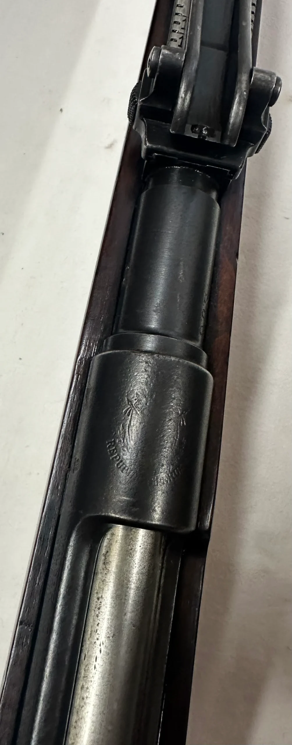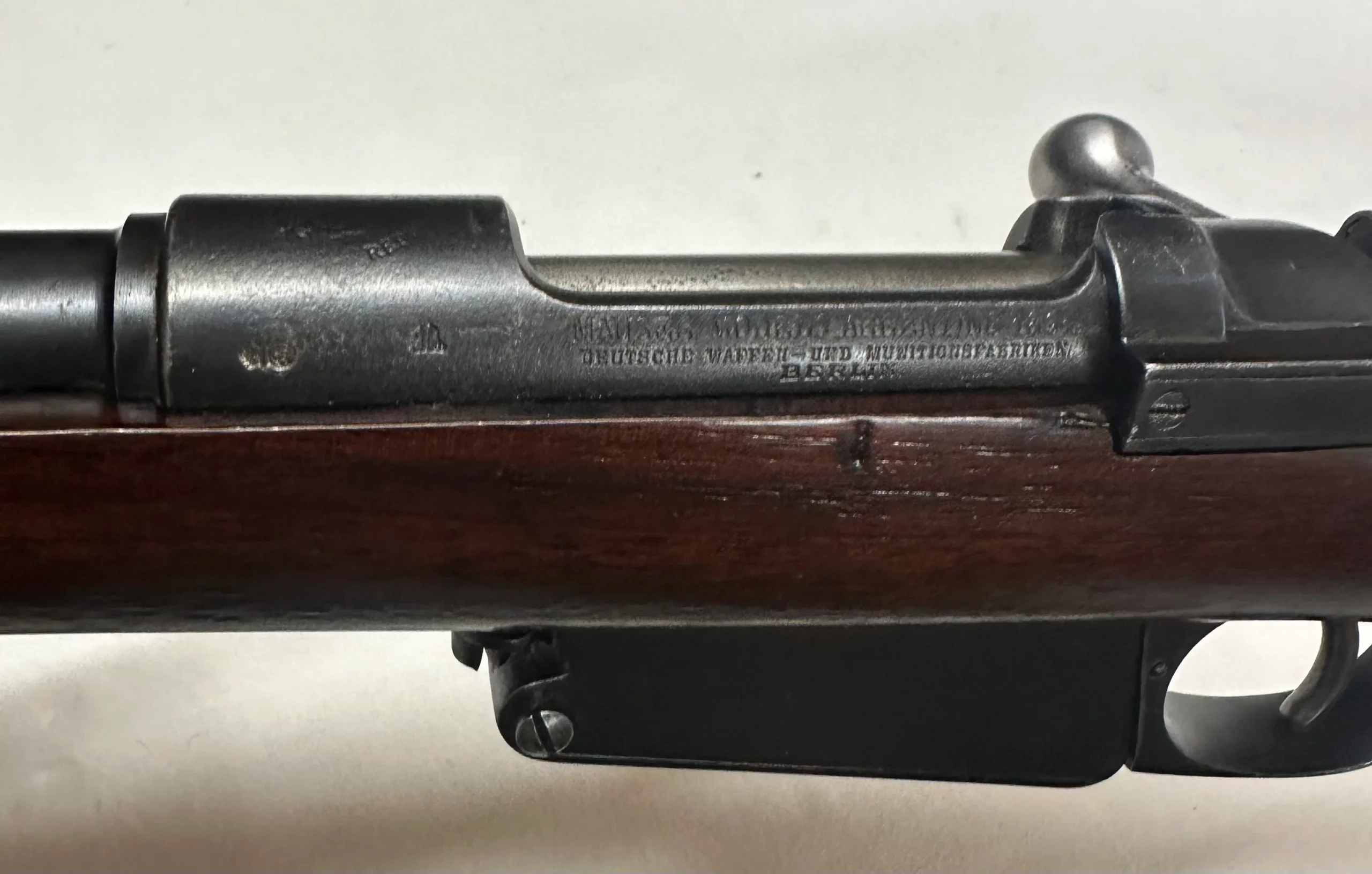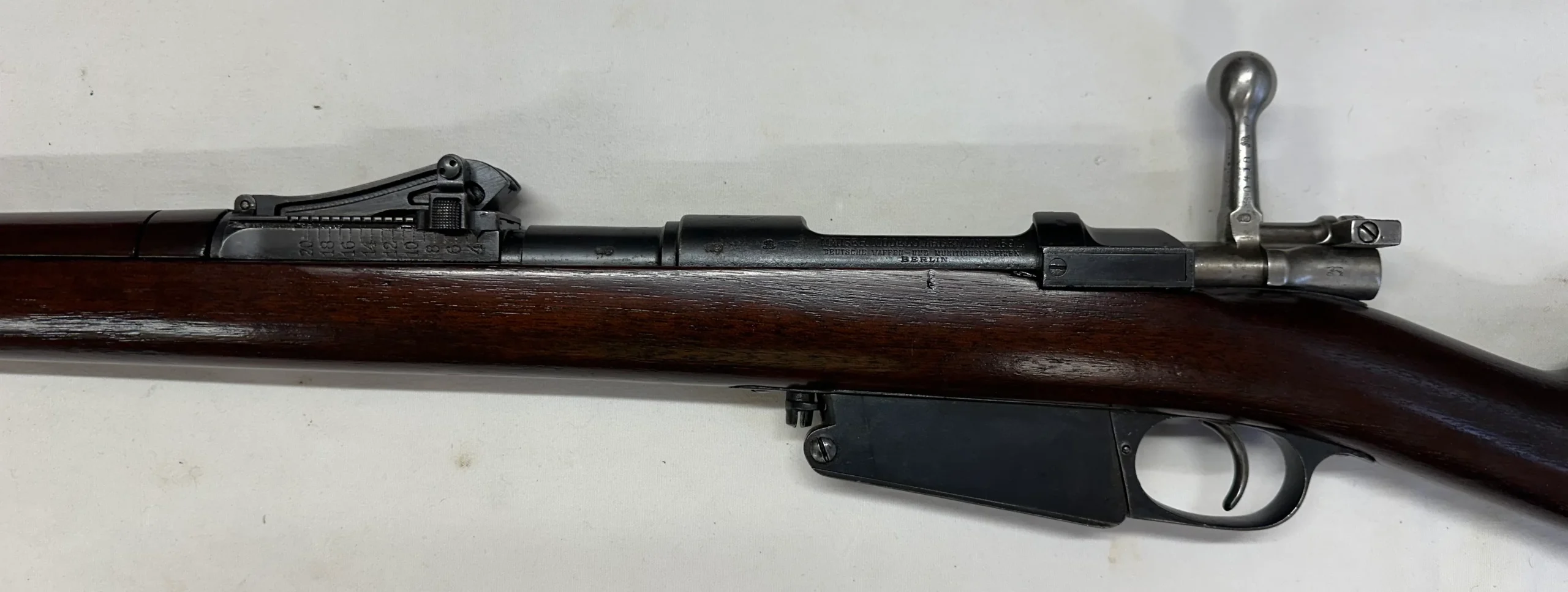 Bien que non monomat, ce fusil Mauser 1891/09 qui est marqué Mauser Modelo Argentino 1891 est en fait un modèle péruvien de 1909 qui est fabriqué pour lke pérou sur une base de fusil 1891 argentin puisque racheté à l’Argentine et ensuite recannoné avec changement de hausse pour la balle pointue en 1909. Très beau fusil, avec une crosse parfaite pratiquement sans coups, ce qui est rare, très beau bronzage, beau marquages sur le boitier mais blason péruvien peu lisible (c’est malheureusement normal, ils ont été même complètement arrasés pour la plupart lors du changement de canon, celui-ci est un canon suisse SIG. Canon très brillant avec de très belles rayures. Arme éprouvée (poinçons d’épreuve allemands).