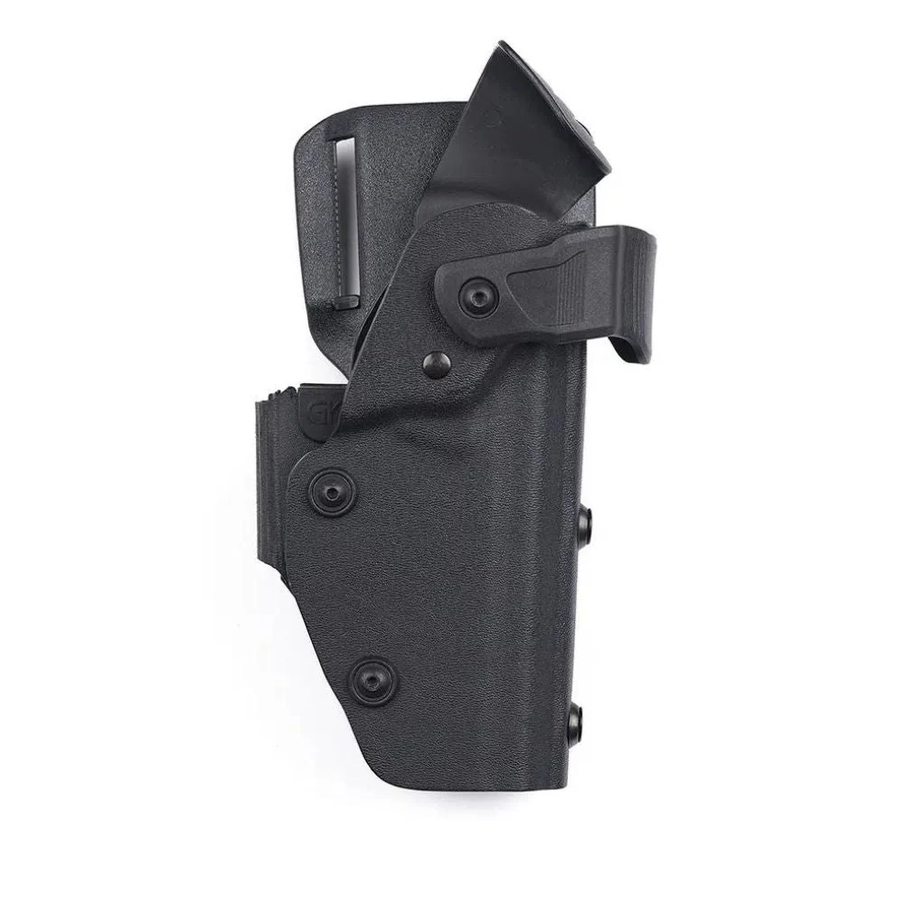 Fabriqué en Kydex résistant, cet holster est conçu pour résister aux déchirures, torsions, chocs et conditions climatiques extrêmes. Son design inclut un rail de guidage et un déflecteur anti-arrachement, assurant une sécurité et une durabilité optimales. Compatible avec les ceinturons de 50 mm, il s’adapte parfaitement à votre équipement professionnel.