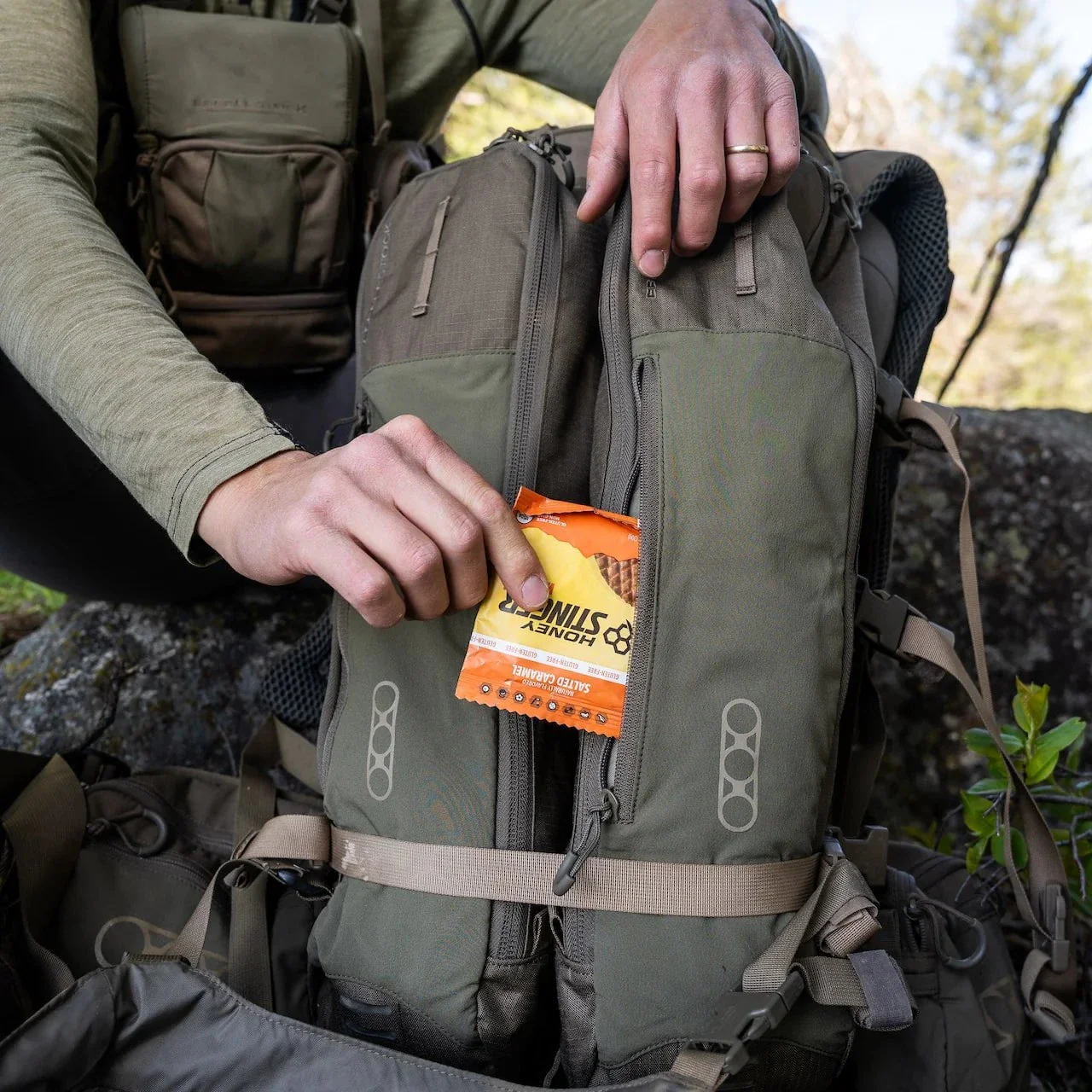 Avec un volume de 11,5 litres, elle dispose de trois compartiments internes et d’une poche extensible zippée sur l’extérieur, facilitant le rangement et l’accès rapide au matériel essentiel. Un support pour poche à eau de 2 litres avec passage pour tuyau est intégré, assurant une hydratation efficace en déplacement.