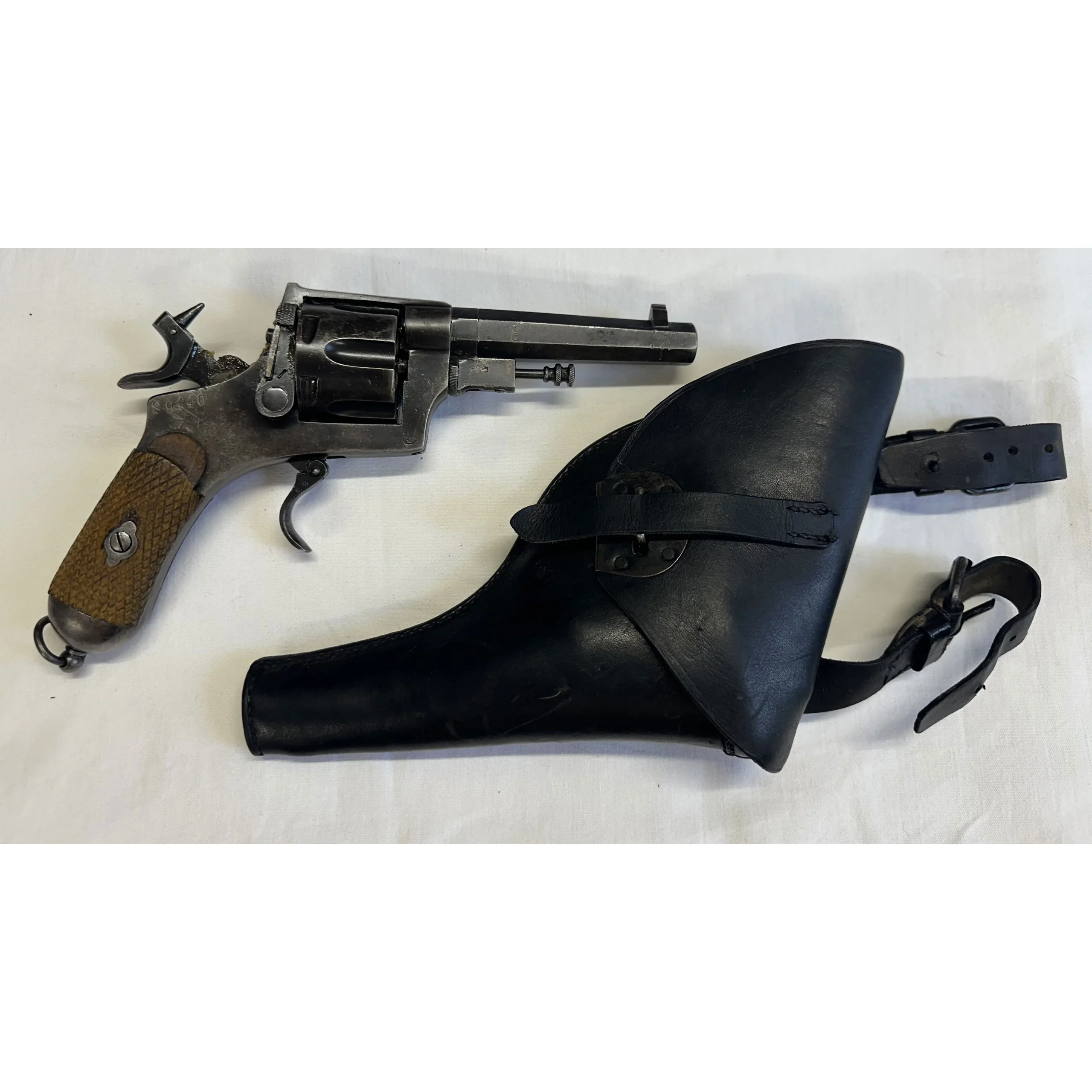 Très intéressant révolver Bodéo type A (troupe) avec étui d’origine en cuir. Très bon état, beau canon, beau bronzage (voir photos), fabrication 1917 Arostegui à Eibar. Une belle pièce pouir votre collection et surtout une arme de catégorie D. Calibre 10.4 Italien (se refait à partir de douilles de .44). Parfait état de fonctionnement.