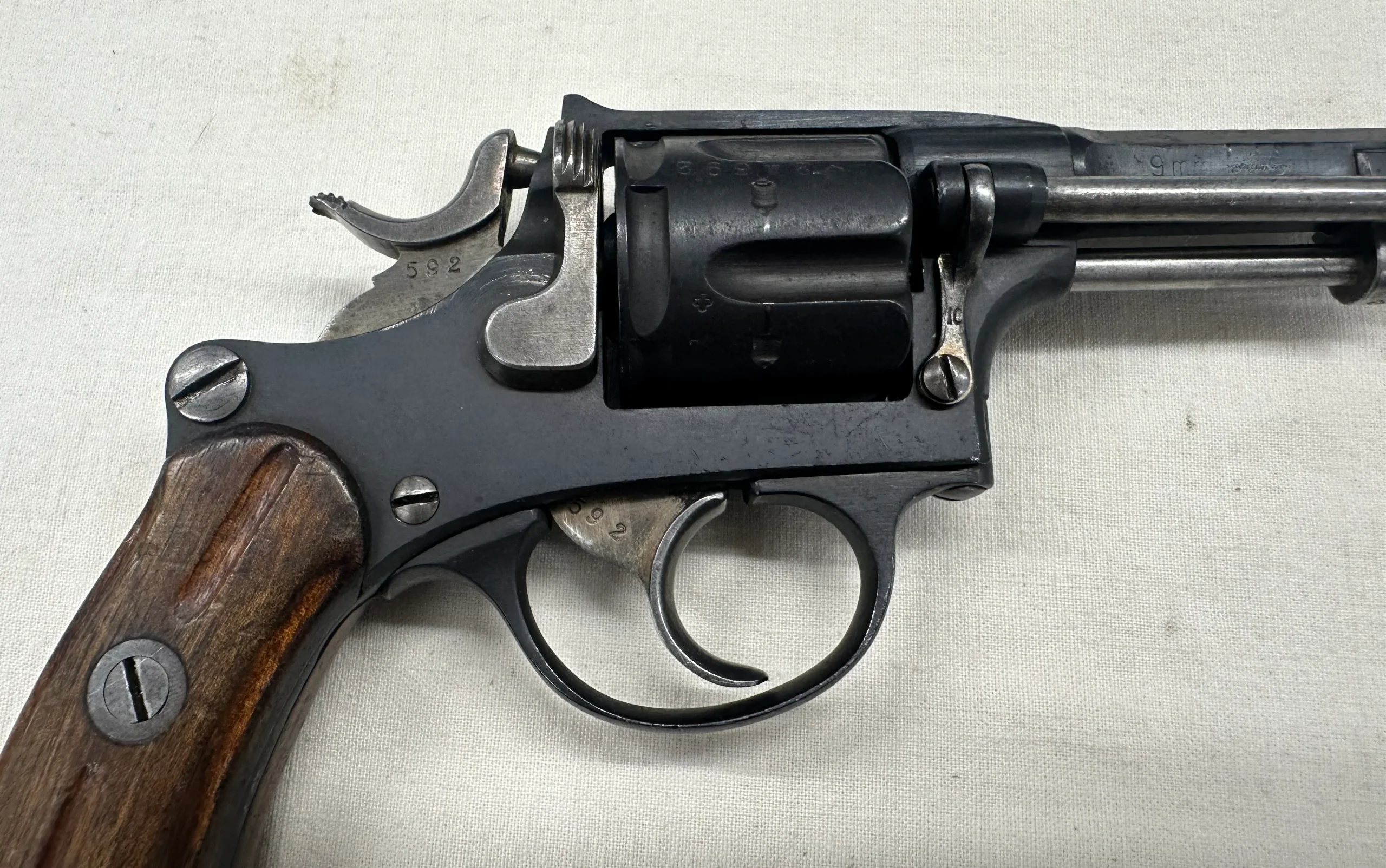 Très beau révolver d’ordonnance suisse Modèle 1882, fabrication Waffen Fabrik Thun, avec un très beau bronzage d’origine et ses plaquettes en bois. Certaines pièces sont jaunes ou blanches d’origine également. Mais le barillet a été réalésé dans un calibre 380 ainsi que le canon qui est lisse… Il est superbe extérieurement et fonctionne parfaitement, mais ne peut plus tirer de cartouches de 7.5 suisse. Parfait pour la collection.