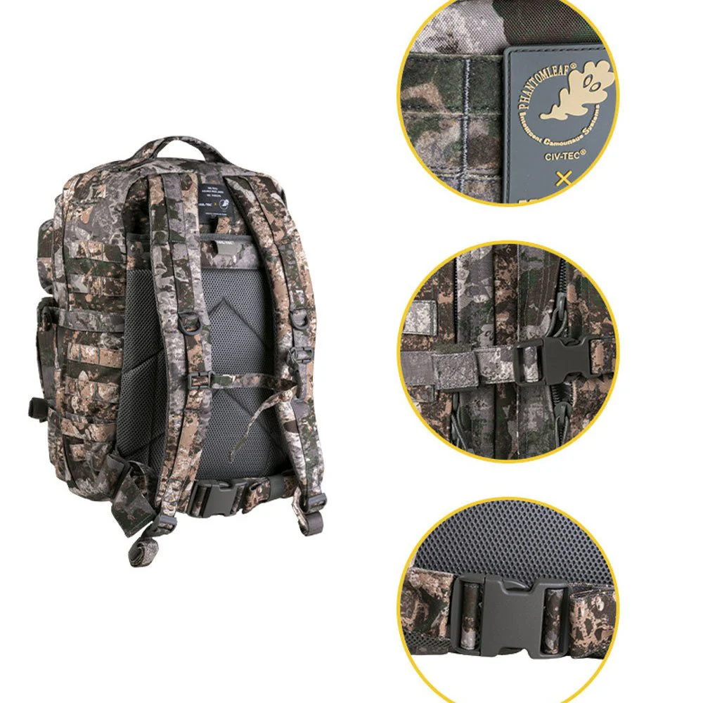 Pour une personnalisation accrue, le Us Assault 36l Civ-Tec est compatible avec le système MOLLE, permettant l’ajout de poches et d’accessoires supplémentaires. Les sangles de compression latérales permettent de contrôler le volume et de fixer les bagages de manière sécurisée. Une poche dédiée pour une poche à eau (vendue séparément) est également incluse, ce qui est idéal pour les missions prolongées.
